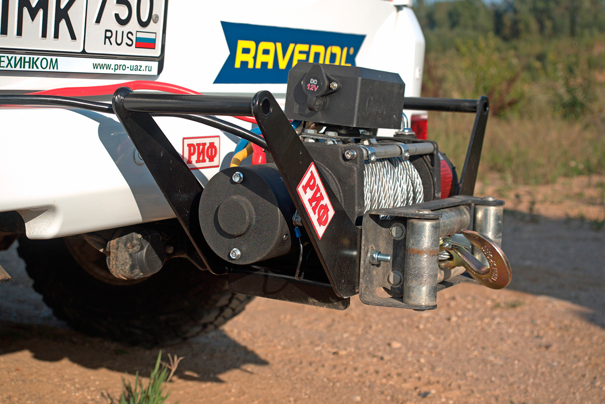 Аналогичный «фаркоп», или, при наличии силового бампера РИФ, переходник для фаркопа можно установить также спереди автомобиля, что даст возможность более полноценно пользоваться переносной лебедкой, вытаскивая застрявший внедорожник не только назад, но и вперед.