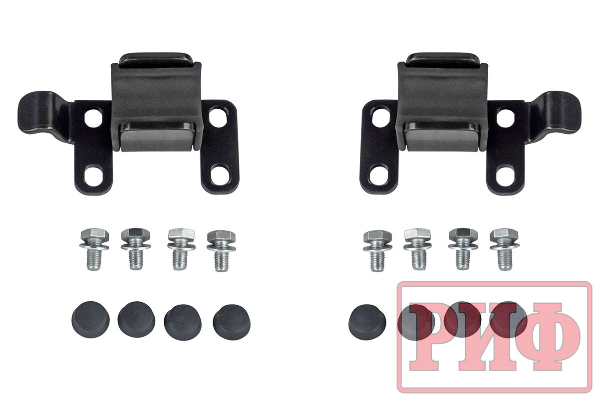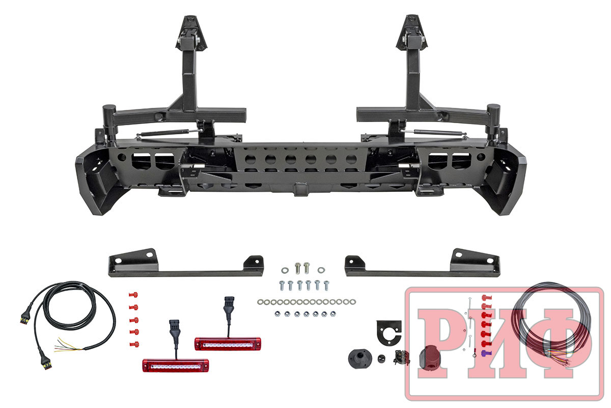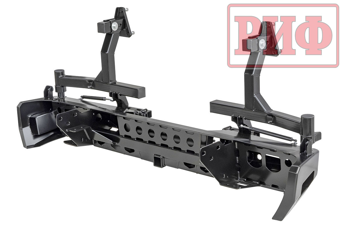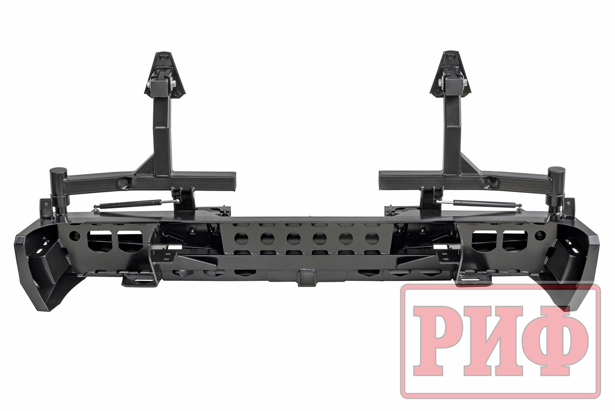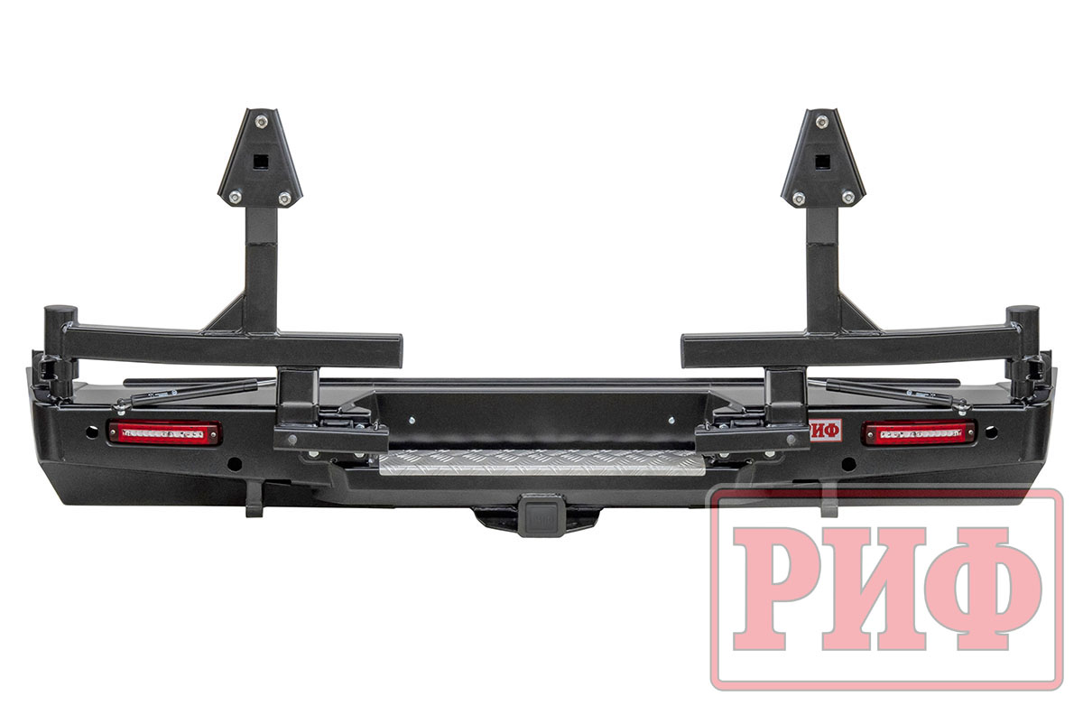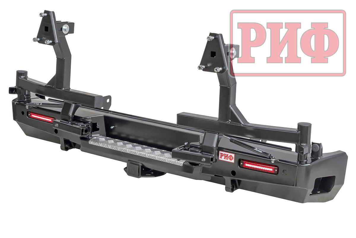 Благодаря тщательно просчитанной конструкции, которая обеспечивает высокие прочность и жесткость изделия, на заднем бампере РИФ возможна перевозка двух колес большого диаметра на калитках. Сами калитки поставляются в комплекте, все монтажные отверстия уже предусмотрены и выполнены в корпусе бампера. Таким образом, можно скомплектовать бампер «под себя». Если нет нужды перемещать запаску на калитку, то бампер покупается без калиток, если достаточно одного запасного колеса на бампере, то калитка ставится одна. В случае установки двух запасок максимально возможный их диаметр – 33 дюйма.