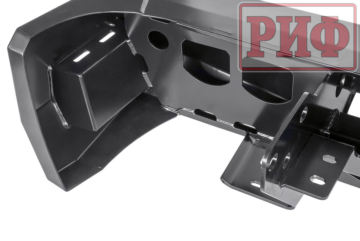 Бампер силовой задний РИФ с фаркопом и возможностью установки двух калиток устанавливается на автомобиль без его переделок и обеспечивает качественную и надежную защиту задней части внедорожника. Бампер изготавливается из стали толщиной 3 мм, усилители, расположенные внутри корпуса обеспечивают высокие прочность и жесткость конструкции, а порошковая окраска создает надежное антикоррозионное покрытие.