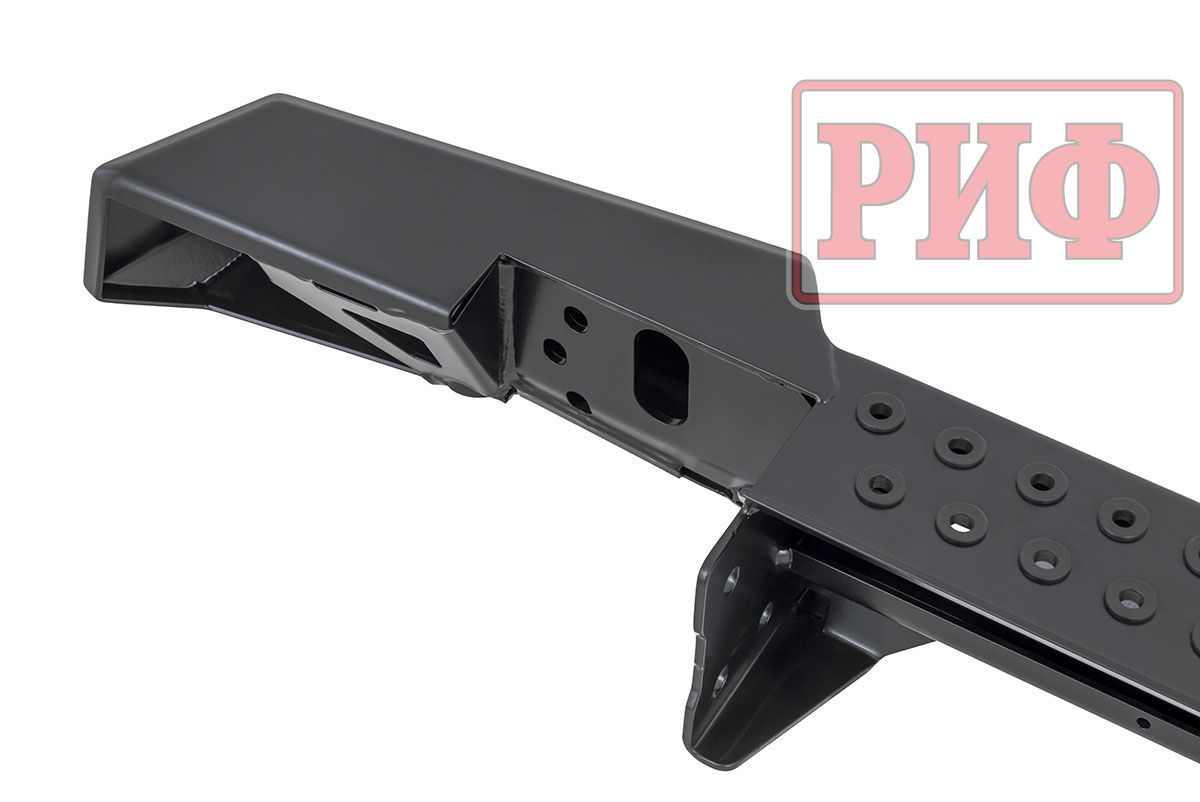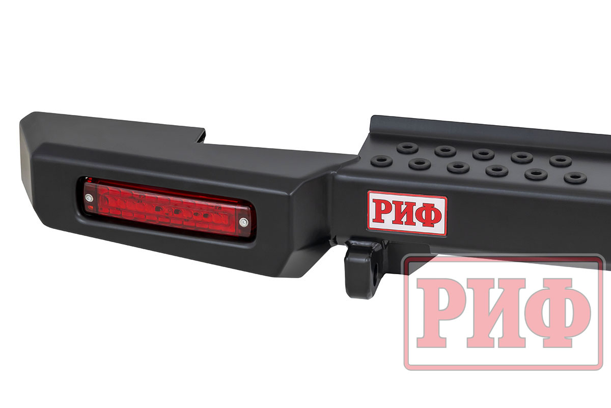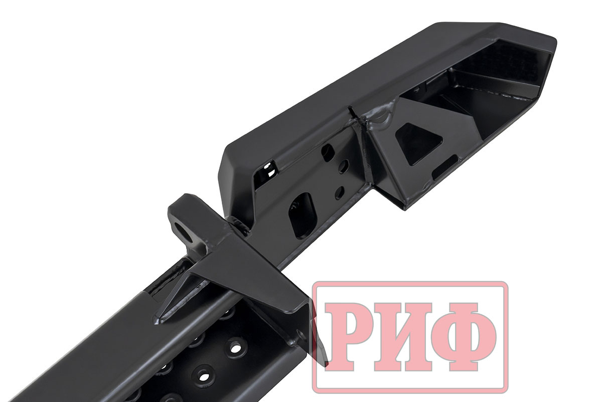 Задний силовой бампер РИФ надежно защитит кузов автомобиля на бездорожье или в городе в случае непредвиденных инцидентов. Бампер оборудован упорами под хай джек и буксирными проушинами для работы с рывковой или буксировочной стропой.