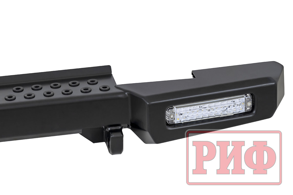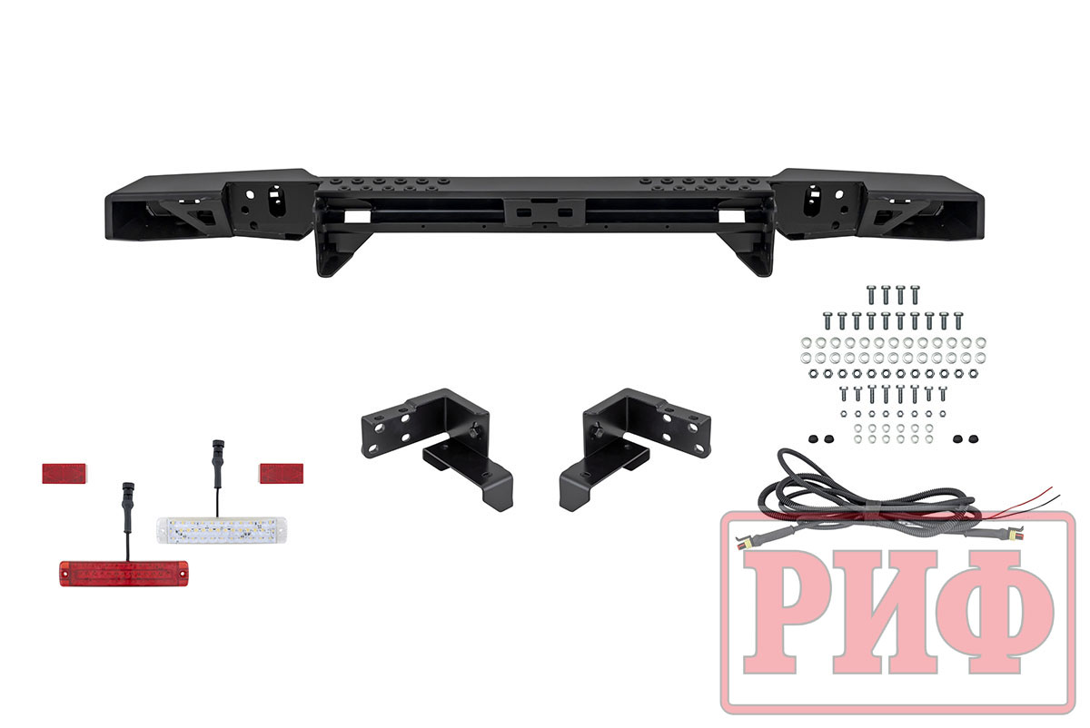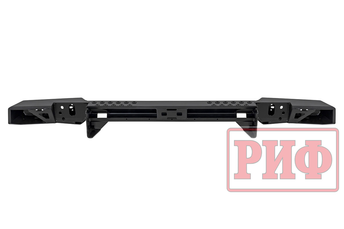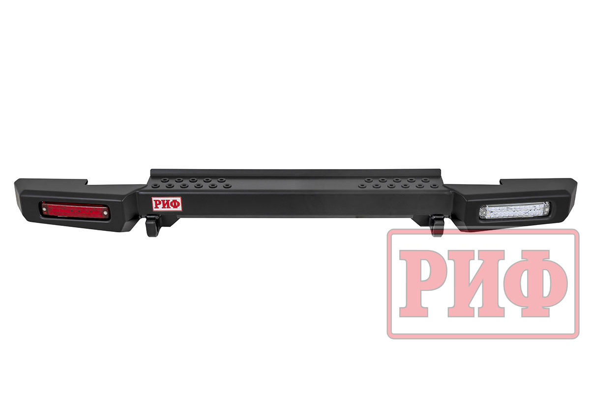 Задний силовой бампер РИФ надежно защитит кузов автомобиля на бездорожье или в городе в случае непредвиденных инцидентов. Бампер оборудован упорами под хай джек и буксирными проушинами для работы с рывковой или буксировочной стропой.