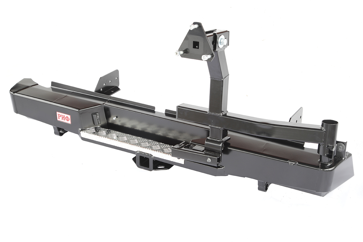 Задний силовой бампер РИФ надежно защитит кузов автомобиля на бездорожье или в городе в случае непредвиденных инцидентов. Бампер оборудован упорами под хай джек и буксирными проушинами для работы с рывковой или буксировочной стропой.
