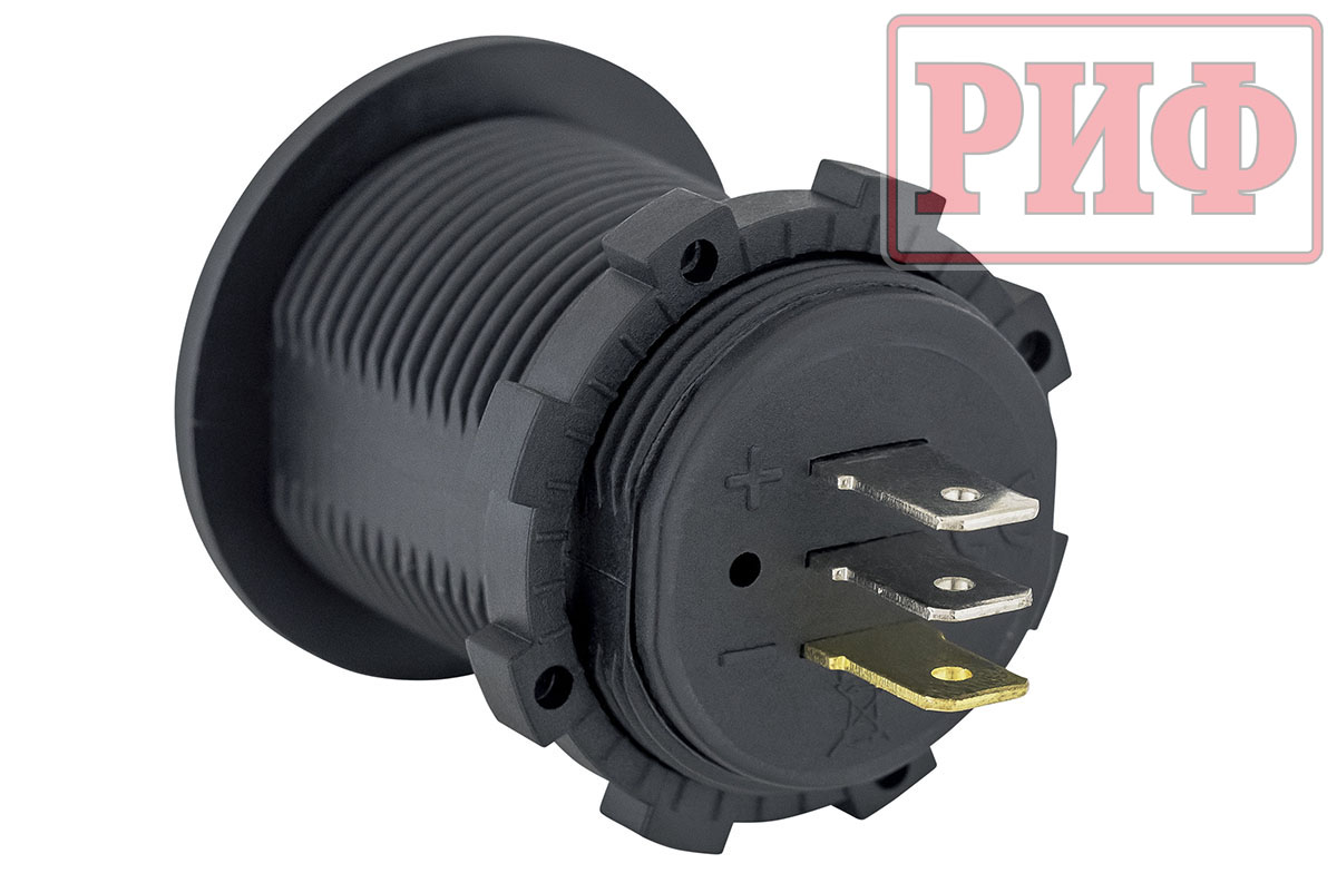 Устройство крепится путем фиксации в отверстии на панели с помощью гайки (в комплекте). Подключение контактов осуществляется плоской клеммой, либо с помощью пайки. Есть функция подсветки