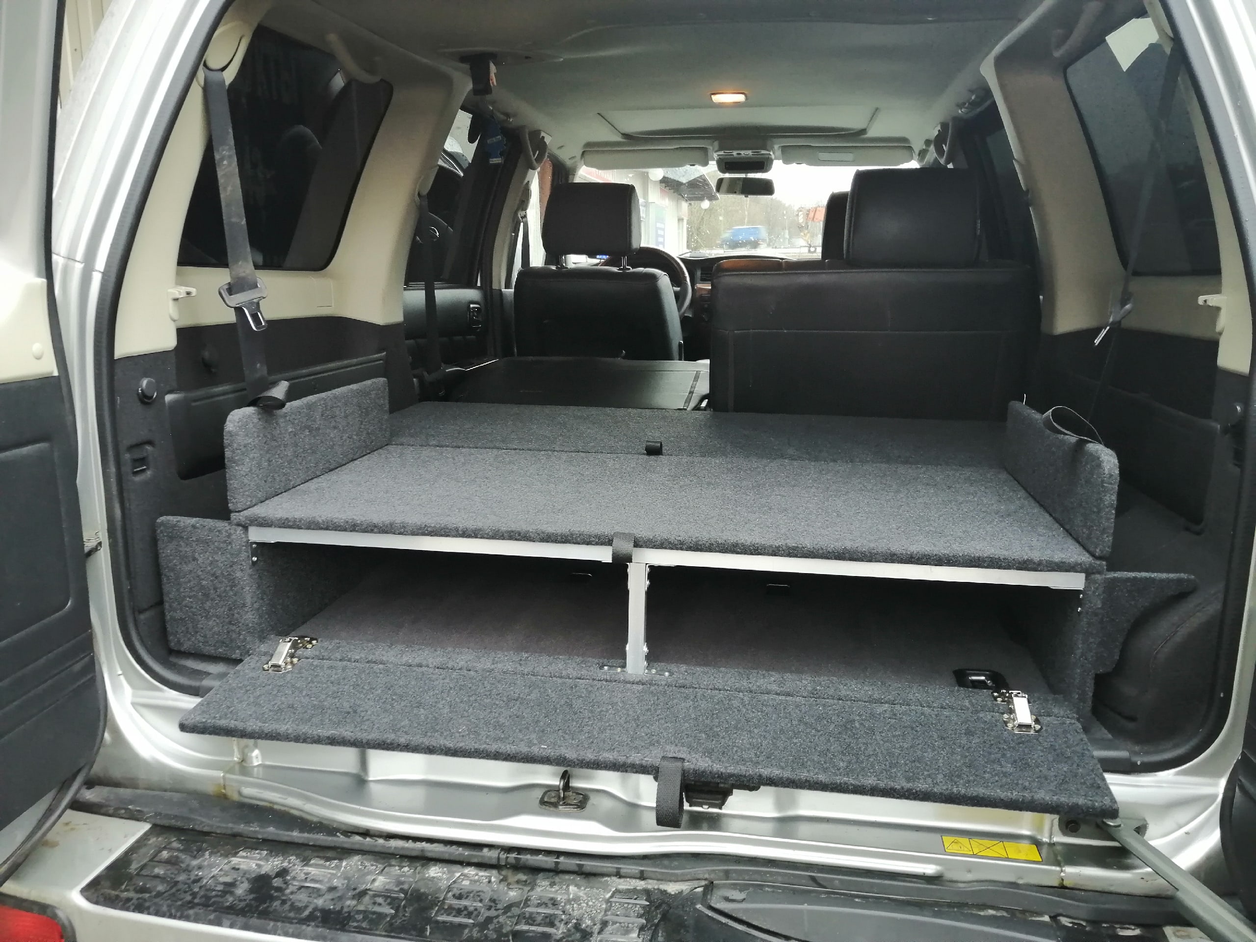 Органайзер-спальник позволяет убрать стропы, огнетушитель, аптечку, компрессор и т.д. в свои просторные ящики. При сложенных спинках задних сидений образует ровный пол, можно обустроить спальное место.